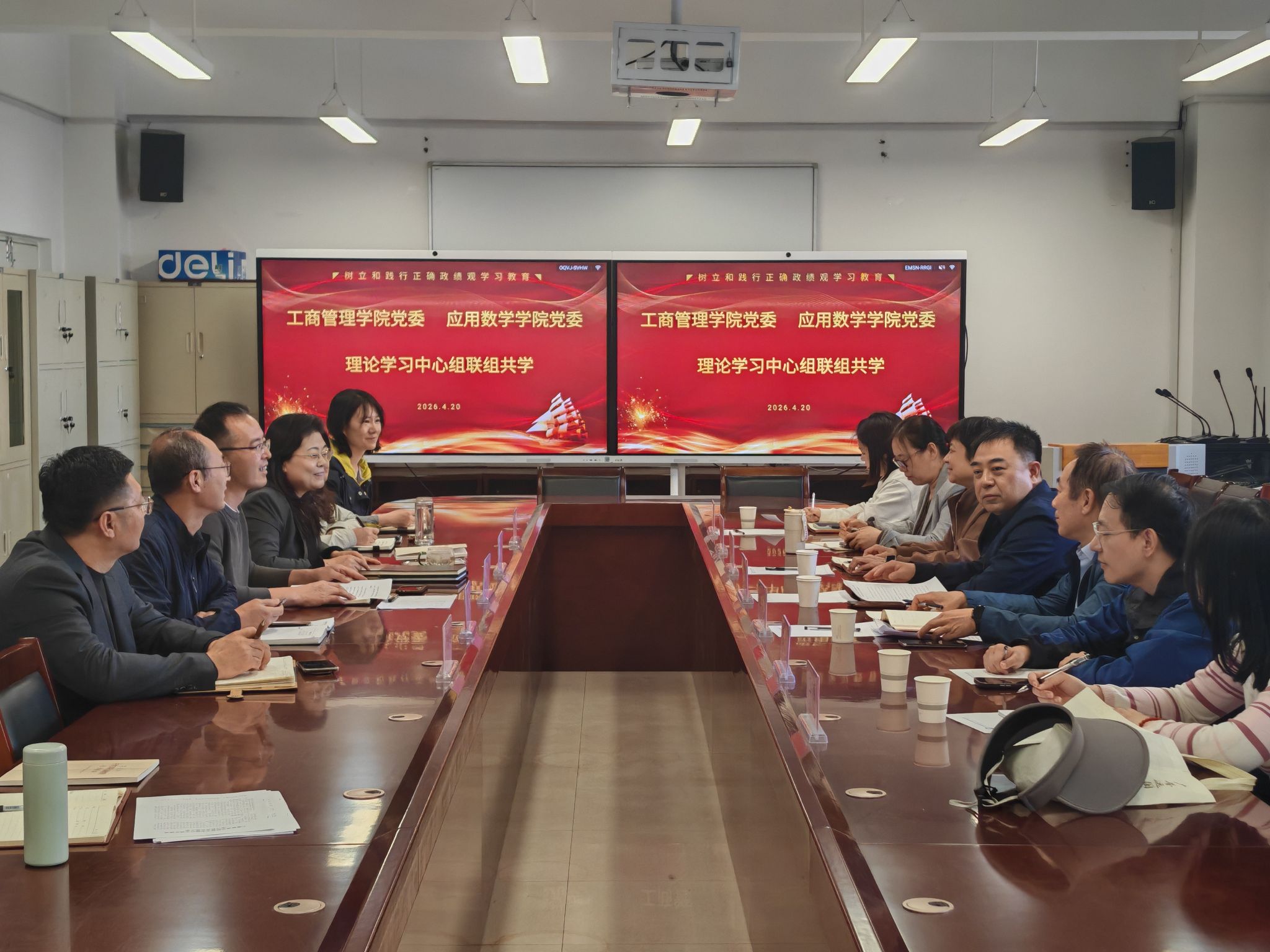 为持续深化树立和践行正确政绩观学习教育,破解学科专业发展壁垒,推动党建与业务深度融合,2026年4月20日,工商管理学院与应用数学学院党委理论学习中心组在工商管理学院会议室开展了联组共学活动。活动围绕“党建引领强根基、学科融合促发展、实干担当育新人”主题,开展集中学习与专题研讨,两学院全体中心组成员、部分骨干教师代表参加,会议由工商管理学院党委书记李群生主持。