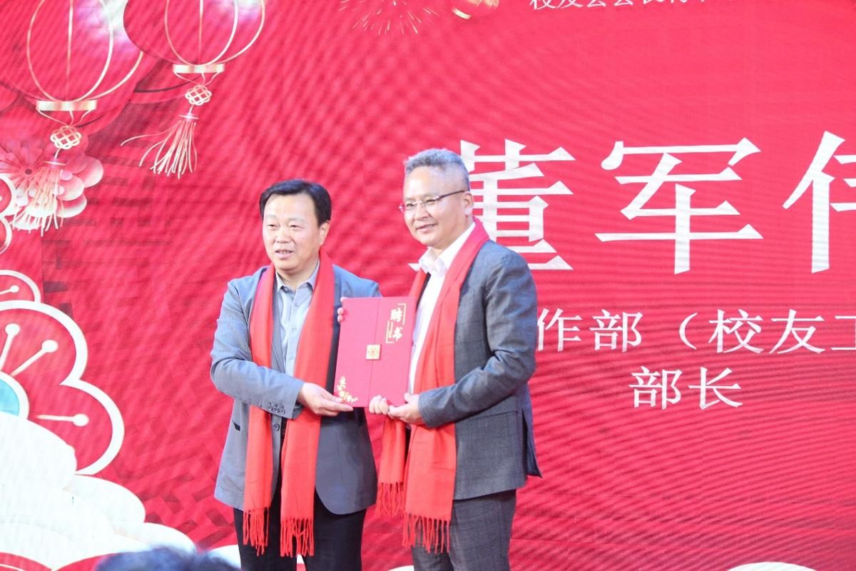 会上,韩俊主任宣读了校友会会长聘任批复,在全场的共同见证下,董军伟部长为新任工商管理学院校友会会长郭海明颁发聘书。