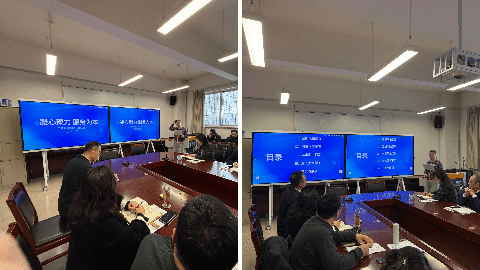 第一阶段为2025年学院教职工双代会。由学院党委书记李群生主持。院工会主席闫向连作工会工作报告,汇报回顾了2025年的工作,展示了新一年的工作设想。
