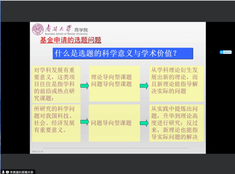 李勇建教授以“国社科特点与注意事项—国自科特点与注意事项—两类项目选择策略”为清晰脉络,展开系统深入的分享。在国家社科基金项目板块,他重点聚焦国家政策与选题方向、项目类别与研究导向,详谈关于国家课题选题与框架设计的几点思考,强调经济与管理学科项目申报理应具有现实性、针对性和较高的决策参考价值。此外,他结合通讯评审的核心指标,拆解了课题论证活页的撰写要点:选题需紧扣国家政策文件、自身研究基础与学科前沿,论证要突出选题依据的现实意义、研究内容的逻辑层次、创新之处的鲜明特色,同时重点阐述代表性研究成果,明确课题的理论与方法创新。