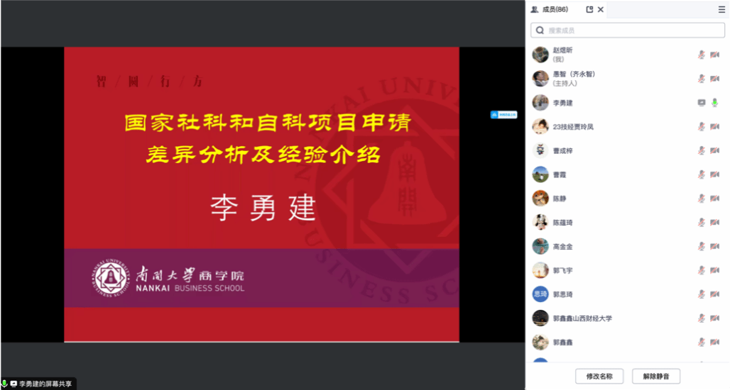 12月10日19:00,我院在腾讯会议举办第51期博士论坛。南开大学二级教授、博士生导师,人文社会科学研究部常务副部长李勇建教授应邀为我院做“国家社科和自科项目申请差异分析及经验介绍”专题讲座。论坛由工商管理学院副院长齐永智教授主持,学院教师及硕博研究生共80余人参会。