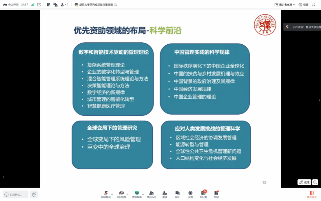 12月11日晚上,复旦大学管理学院范秀成教授应邀在线上腾讯会议平台,围绕“国家自然科学基金项目申请经验”开展了专题分享。论坛由工商管理学院副院长齐永智教授主持,学院教师与硕博研究生70余人参与。范教授结合自身多年学术积累与评审经验,系统解析了国家自然科学基金的申报策略、评审要点与学科前沿趋势,为与会者提供了一场内容翔实、指导性强的学术交流。