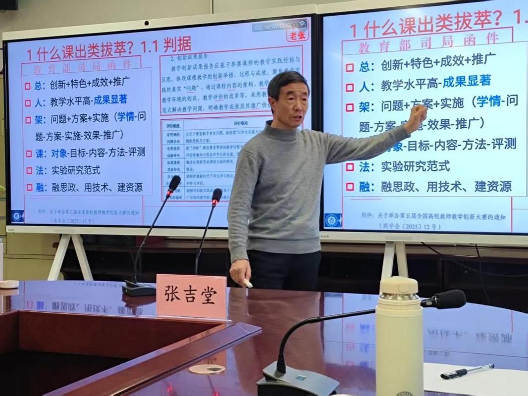 此外,张吉堂教授还从社会、学校与个人发展的三重维度,深刻剖析了参与教学竞赛的深远意义。他指出,这不仅是为教育改革树立“样板”、为学校发展营造氛围、为个人成长搭建平台,更是一次系统性反思与提升教学能力的宝贵契机。他也提醒教师们注意避免申报中缺少框架、主题模糊、论证乏力等常见问题,鼓励大家在扎实的教学积淀中提炼真问题、展现真功夫。