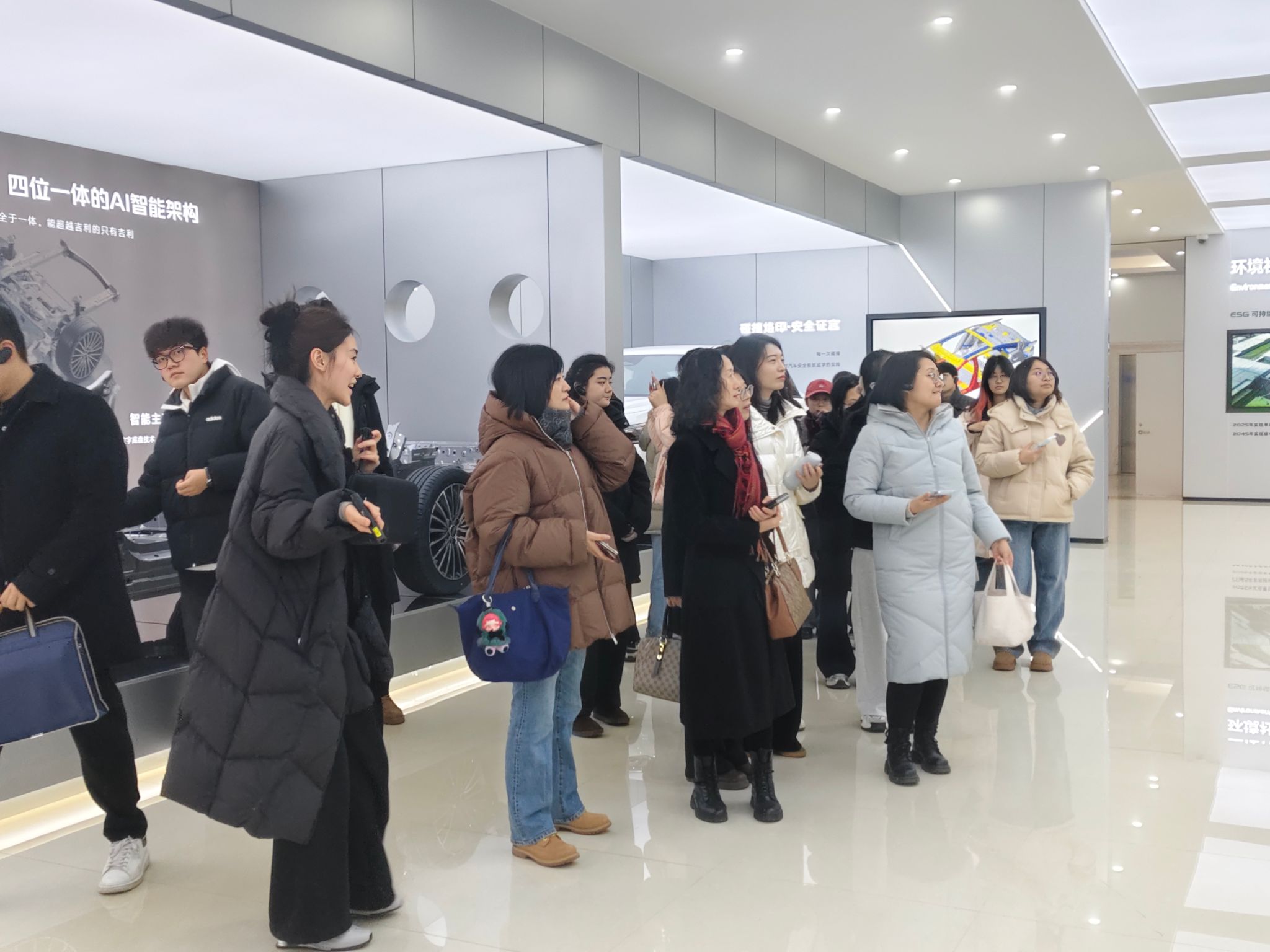 活动开始,师生们来到公司展示大厅,通过沉浸式讲解与互动交流,深入了解了吉利汽车的创业历程与发展脉络,近距离感受了现代智能制造的先进水平,并对公司的经营理念与核心技术有了更直观的认识。