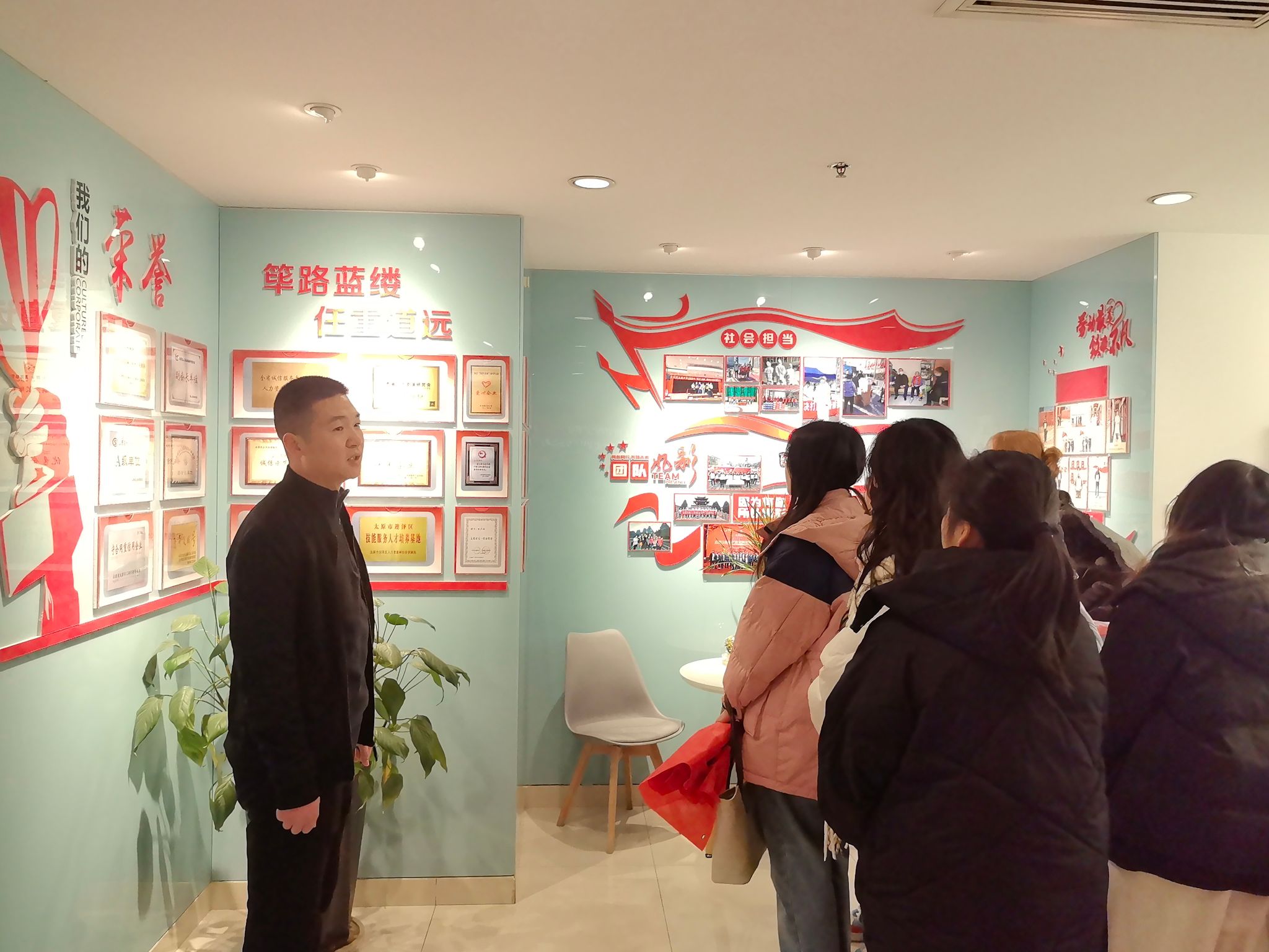 本次实践活动采取实地参观与座谈交流的形式,旨在帮助学生了解人力资源服务业发展现状与前沿动态,促进理论知识与行业实践紧密结合。首先,程帆帆带领师生参观了公司的办公场所、展厅及荣誉墙,介绍了企业概况、主营业务、社会荣誉、行业发展及员工风采。